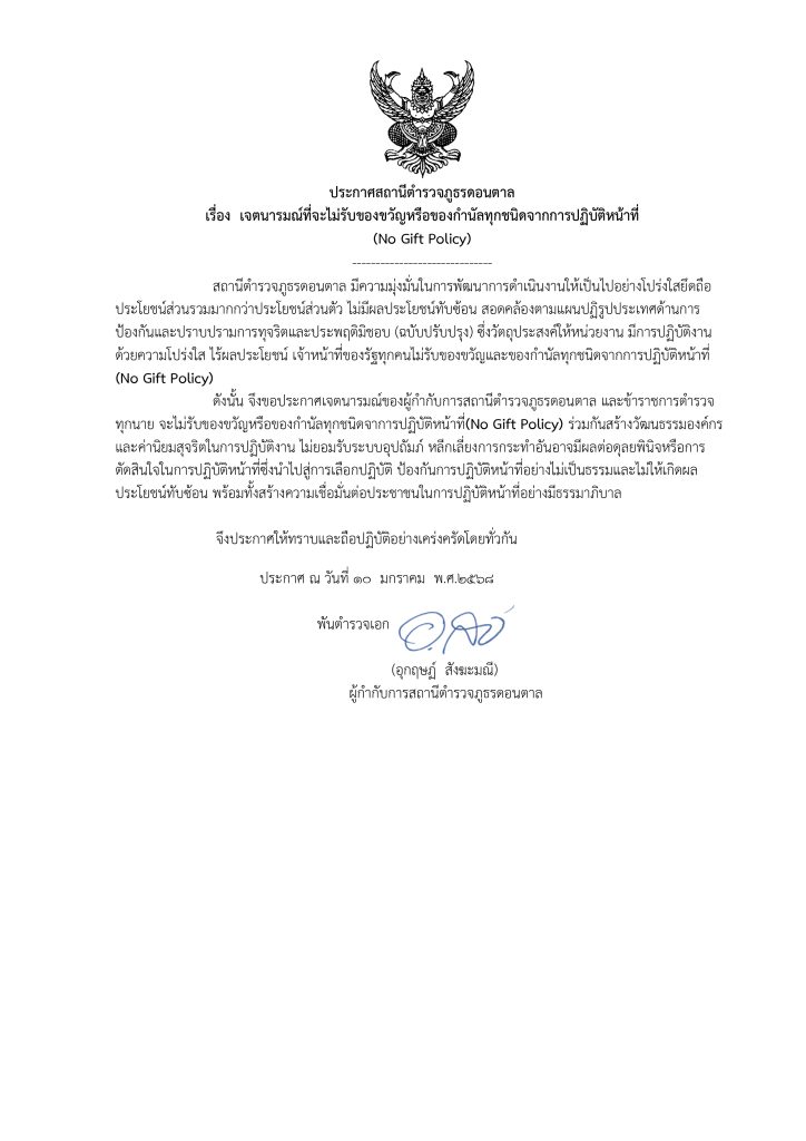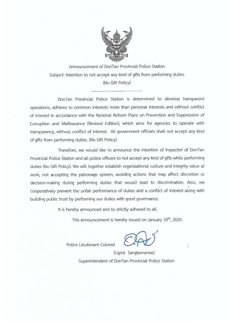 ประกาศเจตนารมณ์นโยบายต่อต้านการรับสินบน (Anti-Bribery Policy) และการไม่รับ ของขวัญของกำนัลหรือประโยชน์อื่นใด (No Gift Policy) สภ.ดอนตาล
